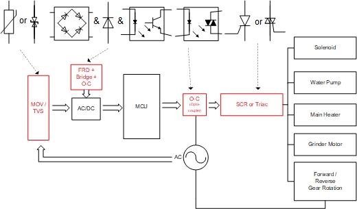 应用于消费电子领域,CQ9传奇电子微电 能提供比较齐全的元件解决方案。比如:AC 输入端防浪涌的压敏电阻(MOV)、电源部分用快恢复二极管(FRD, fast recovery diode)及整流桥(Bridge)、光电隔离器件(Opto-coupler)、控制负载通断的可控硅(SCR & Triac)等。